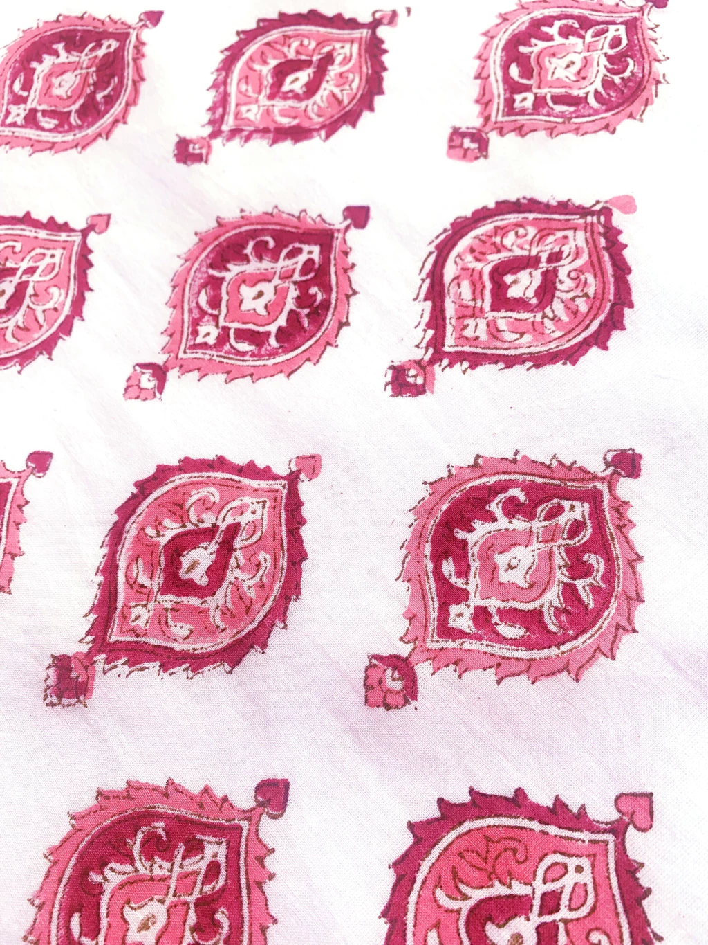 Algodón estampado con la técnica block print en color blanco con dibujos en rosa y morado.