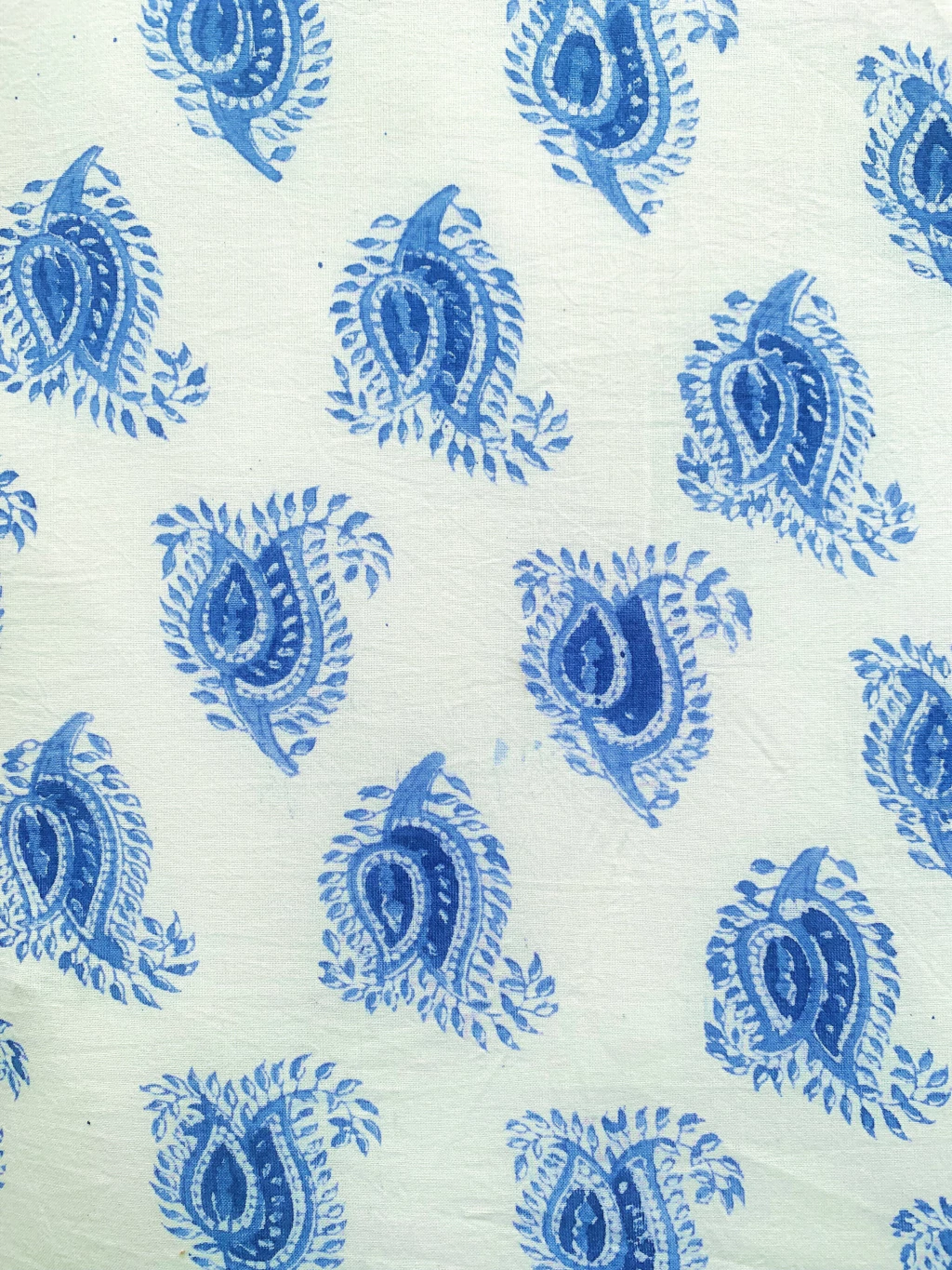 Algodón estampado con la técnica block print en color blanco con dibujos en azul y celeste.