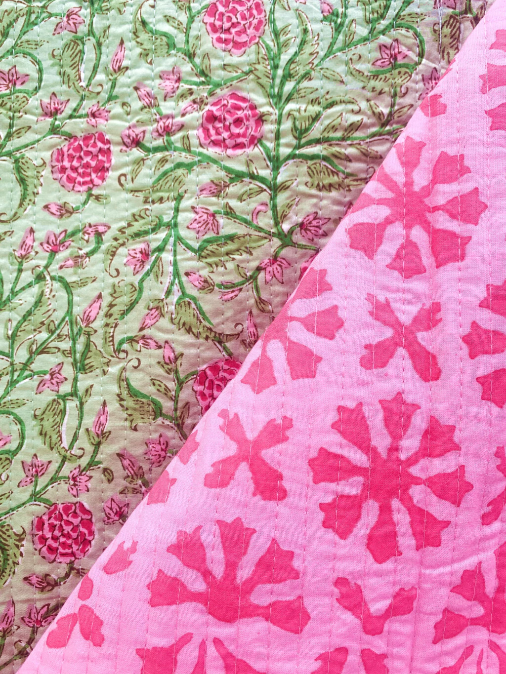 Doble Algodón Block Print con guata en el medio, con costura industrial a lo largo de la tela.