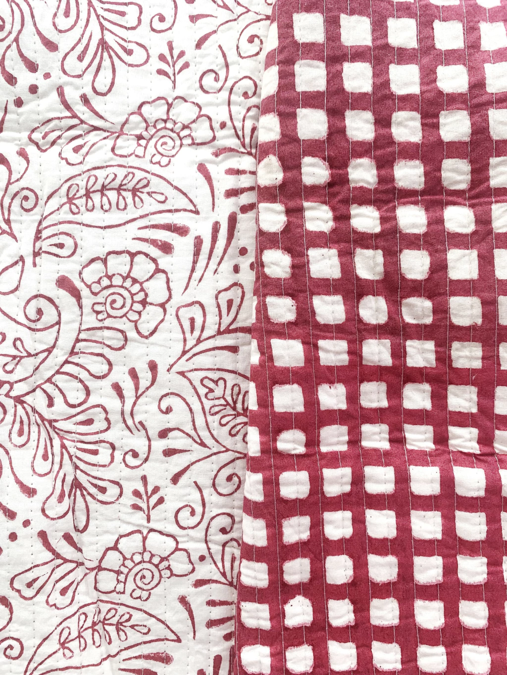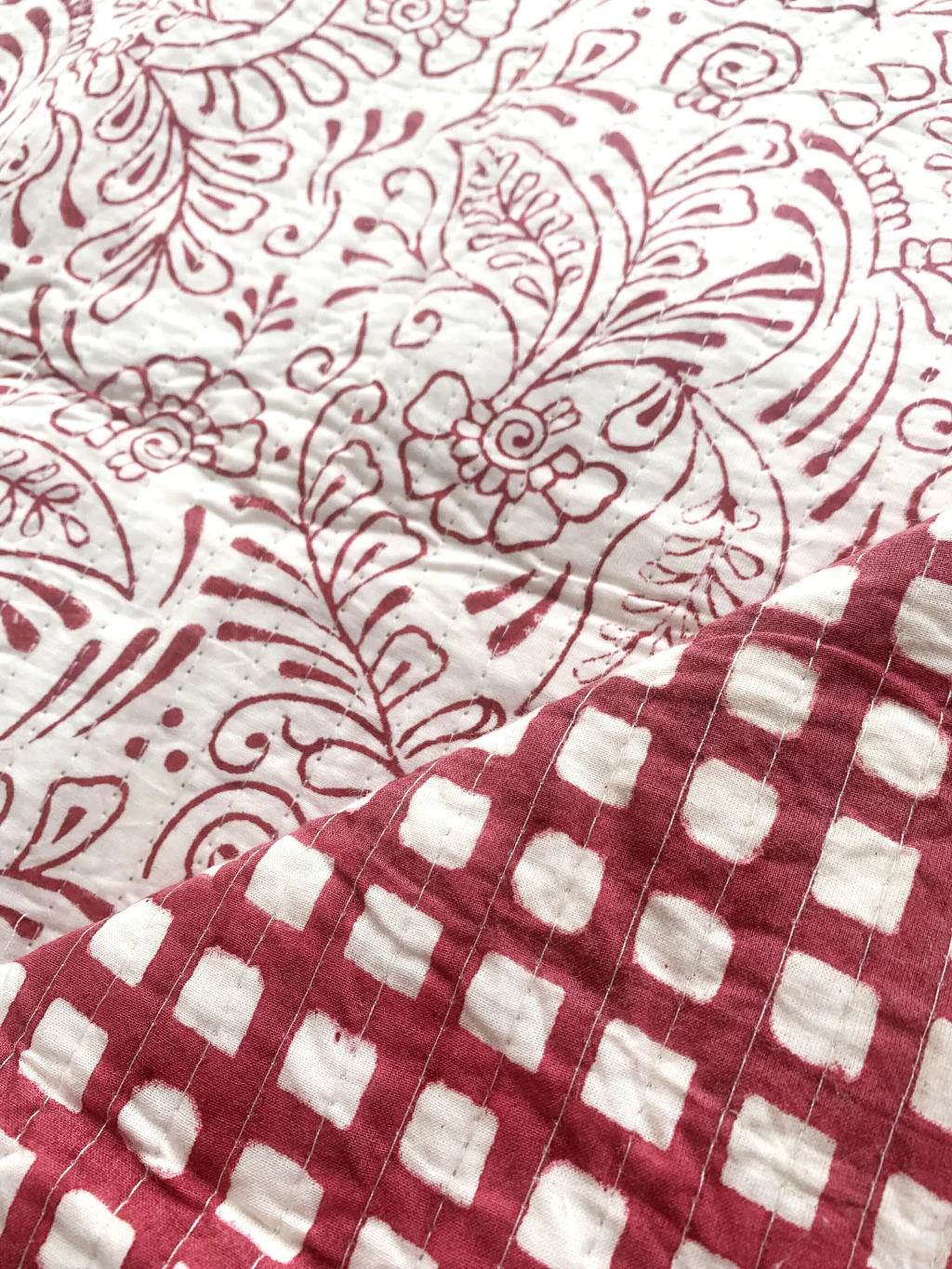 Doble Algodón Block Print con guata en el medio, con costura industrial a lo largo de la tela.