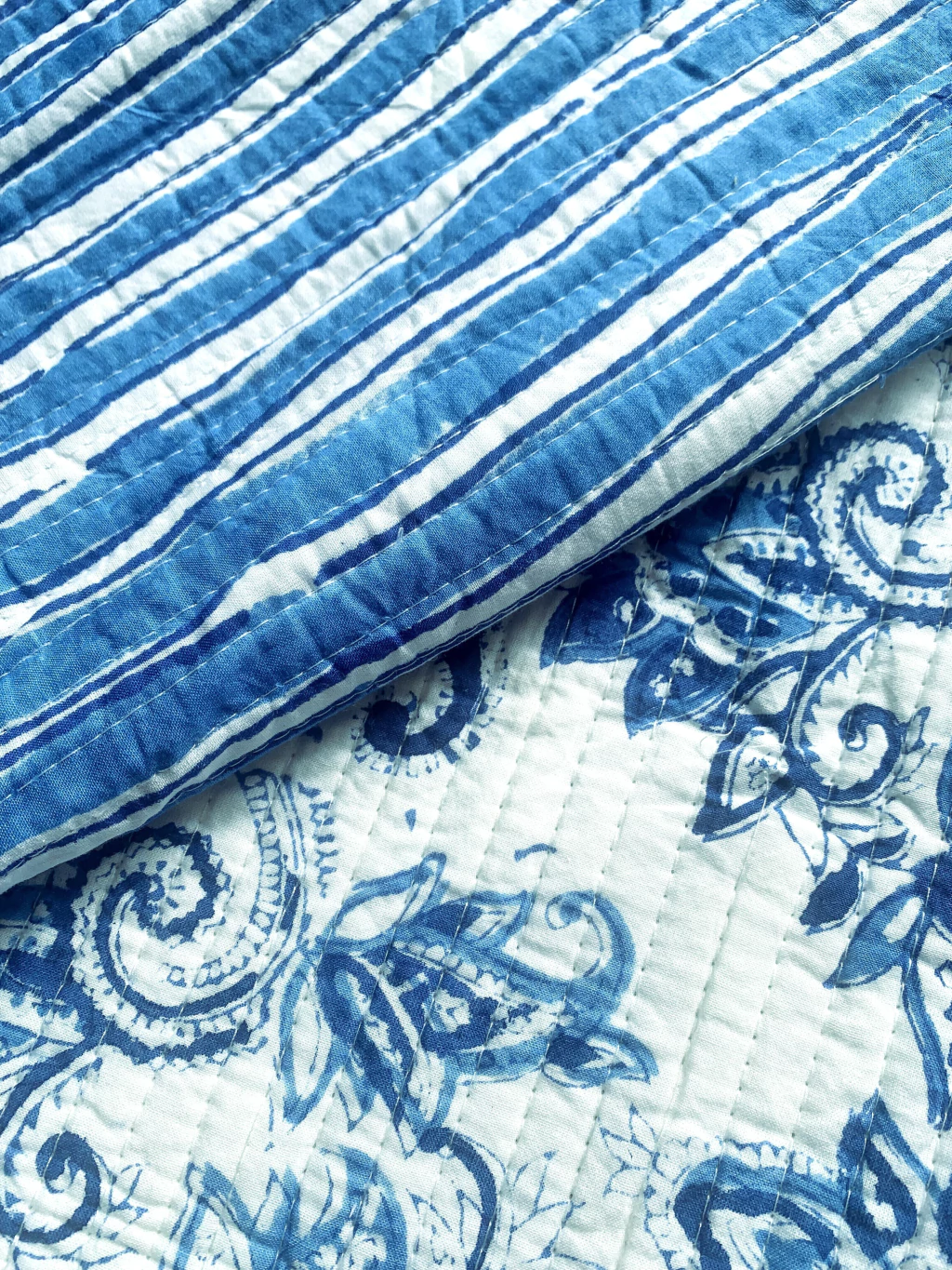 Doble Algodón Block Print con guata en el medio, con costura industrial a lo largo de la tela.