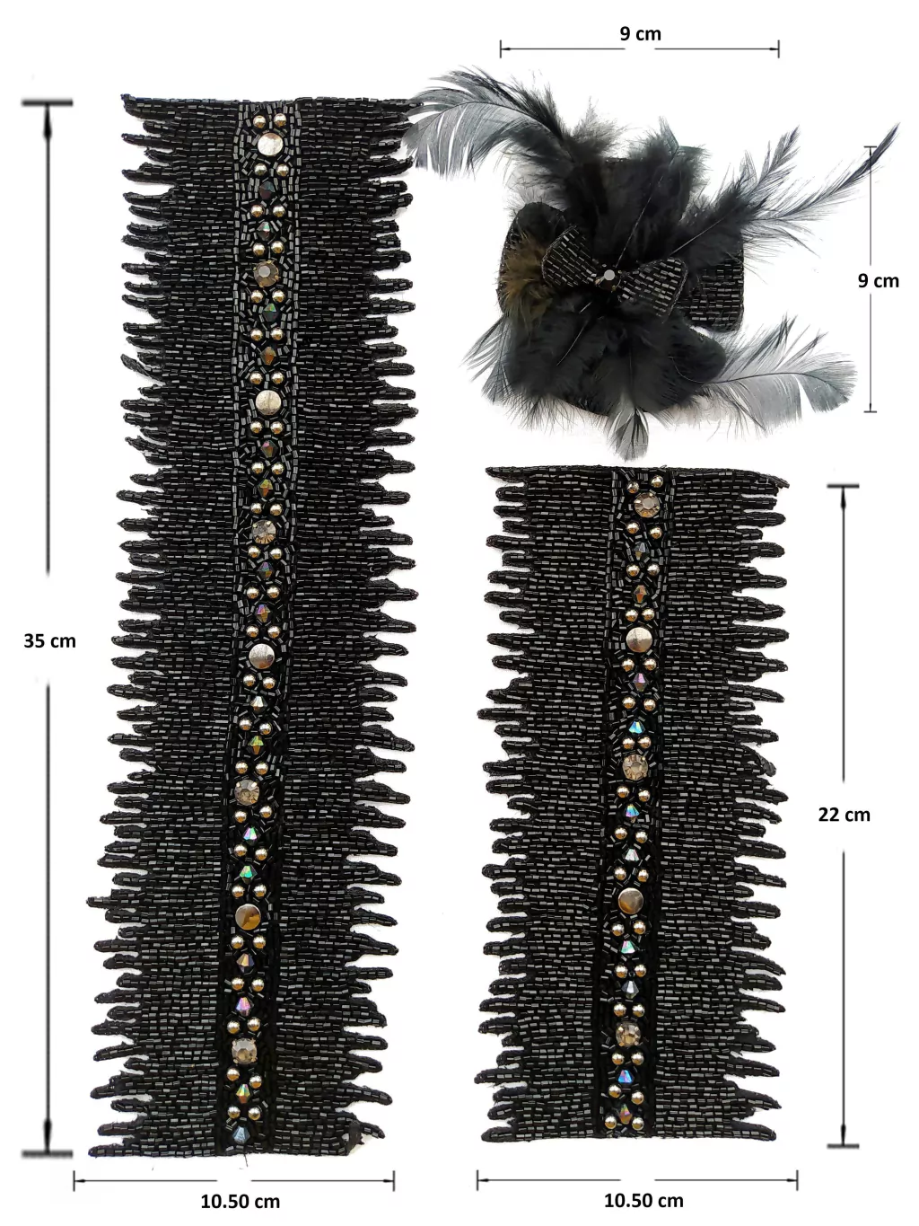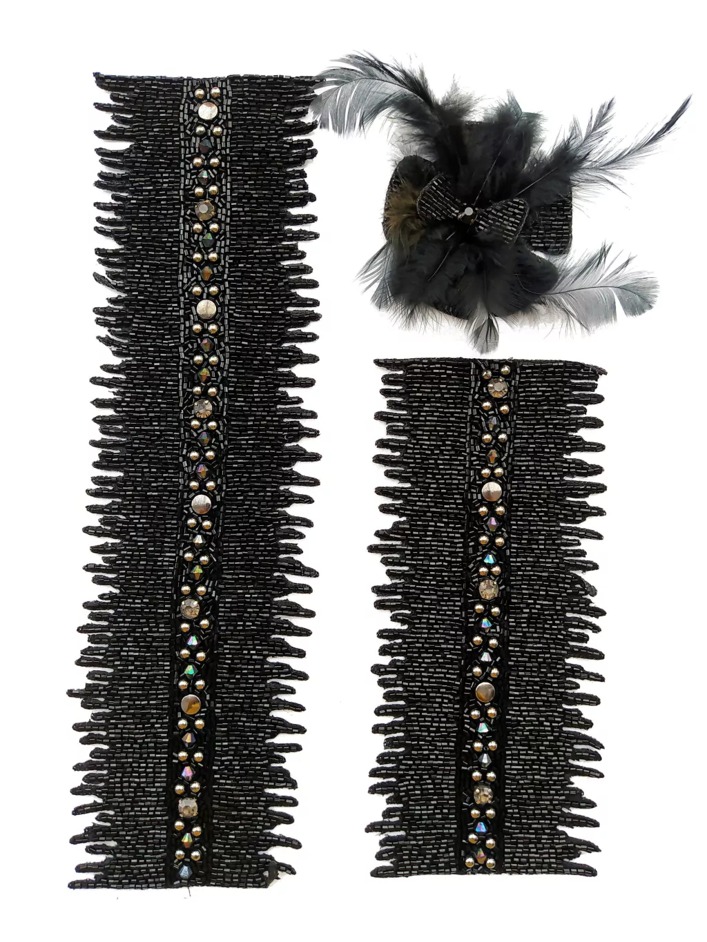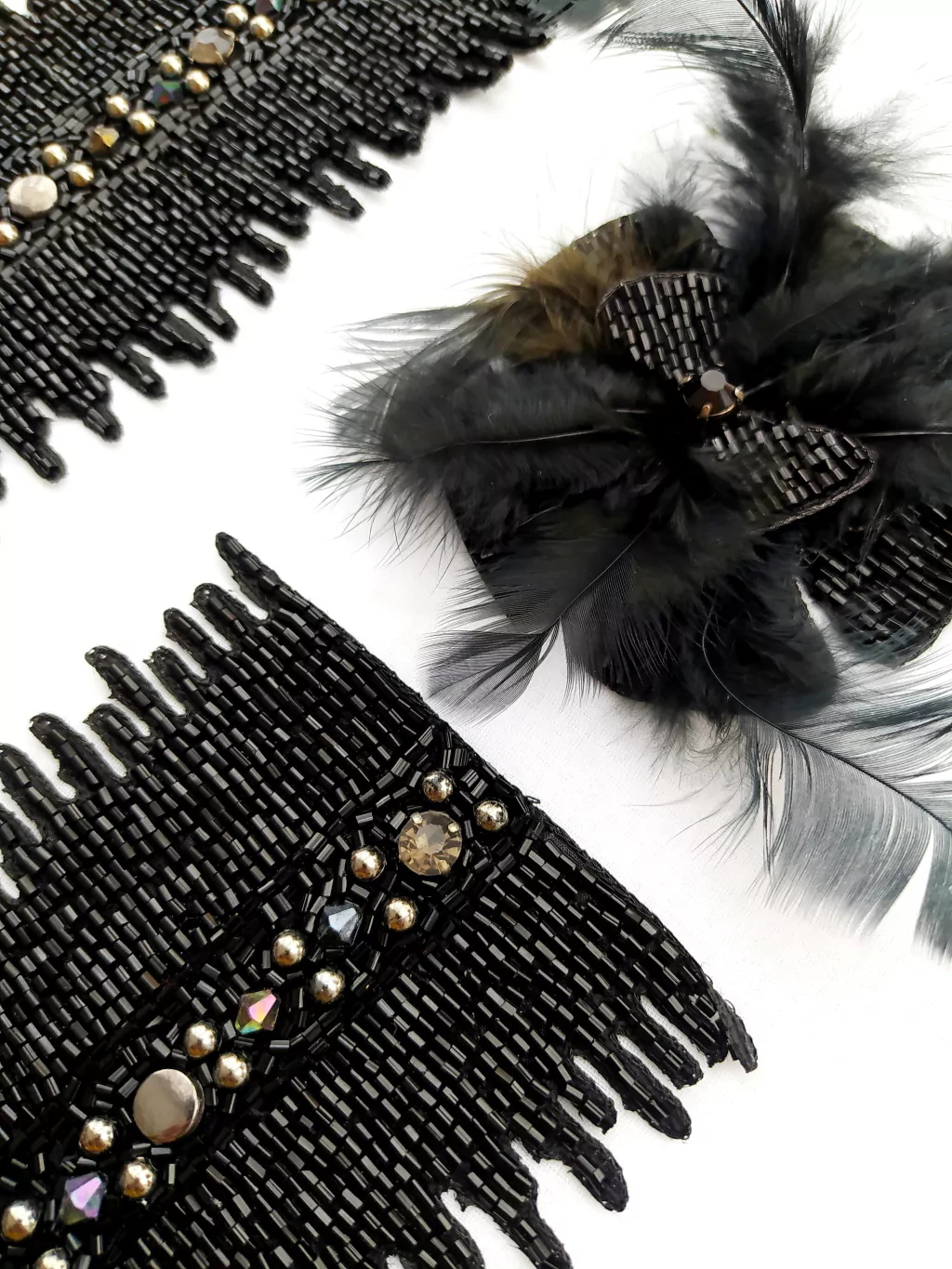 Aplique de forma rectangular compuesto por 3 piezas una flor con plumas y dos fajas bordadas con canutillos negros y piedras metalicas.