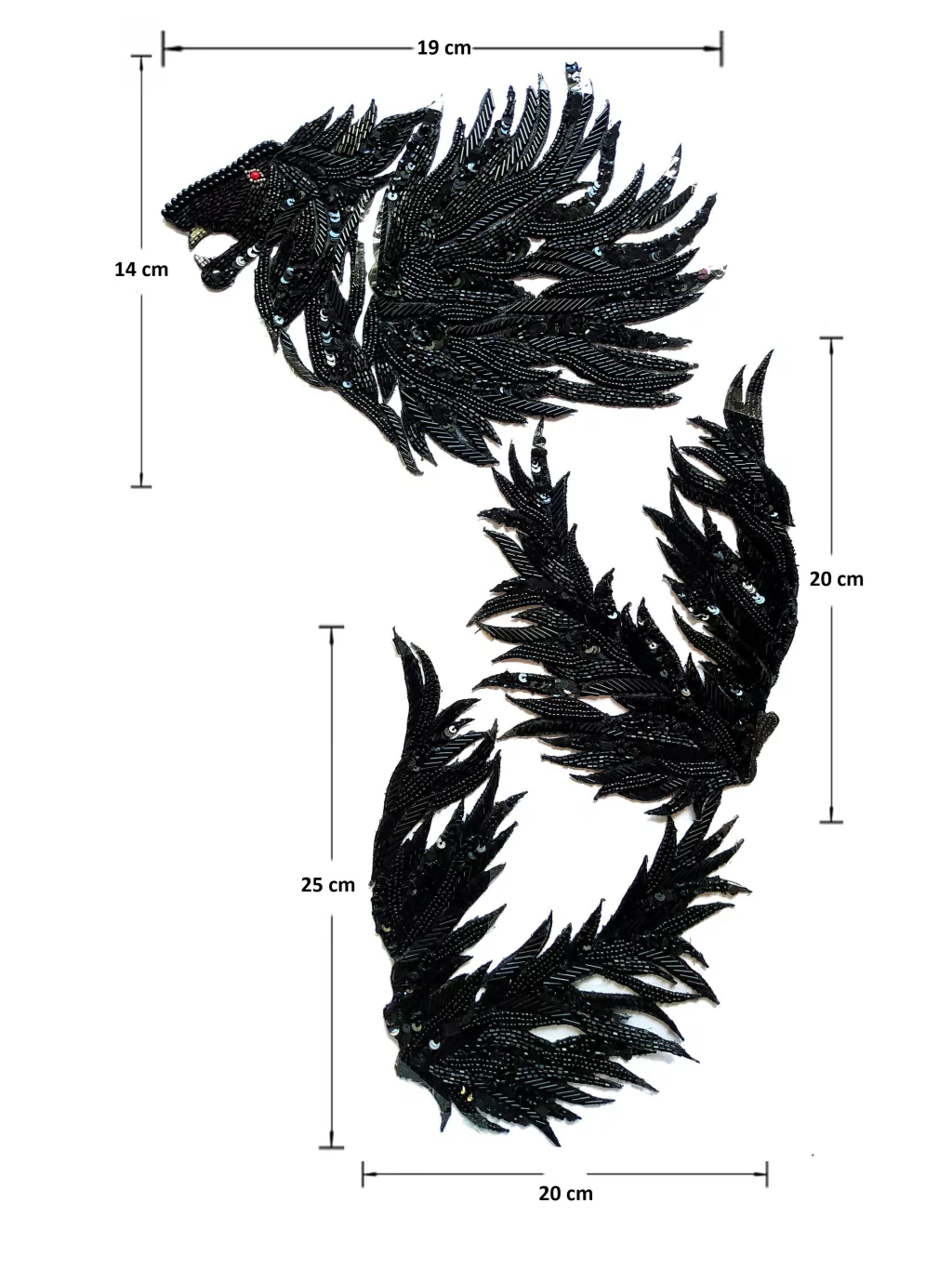 Aplique en forma de león compuesto por 3 piezas en color negro bordado con canutillos y lentejuelas.