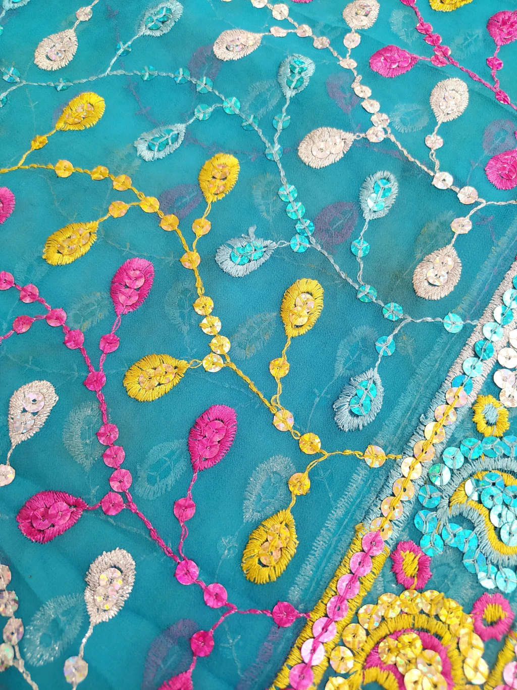 Duphata de gasa turquesa con bordado liviano de lentejuelas e hilo plateado, verde lima, fucsia y turquesa.